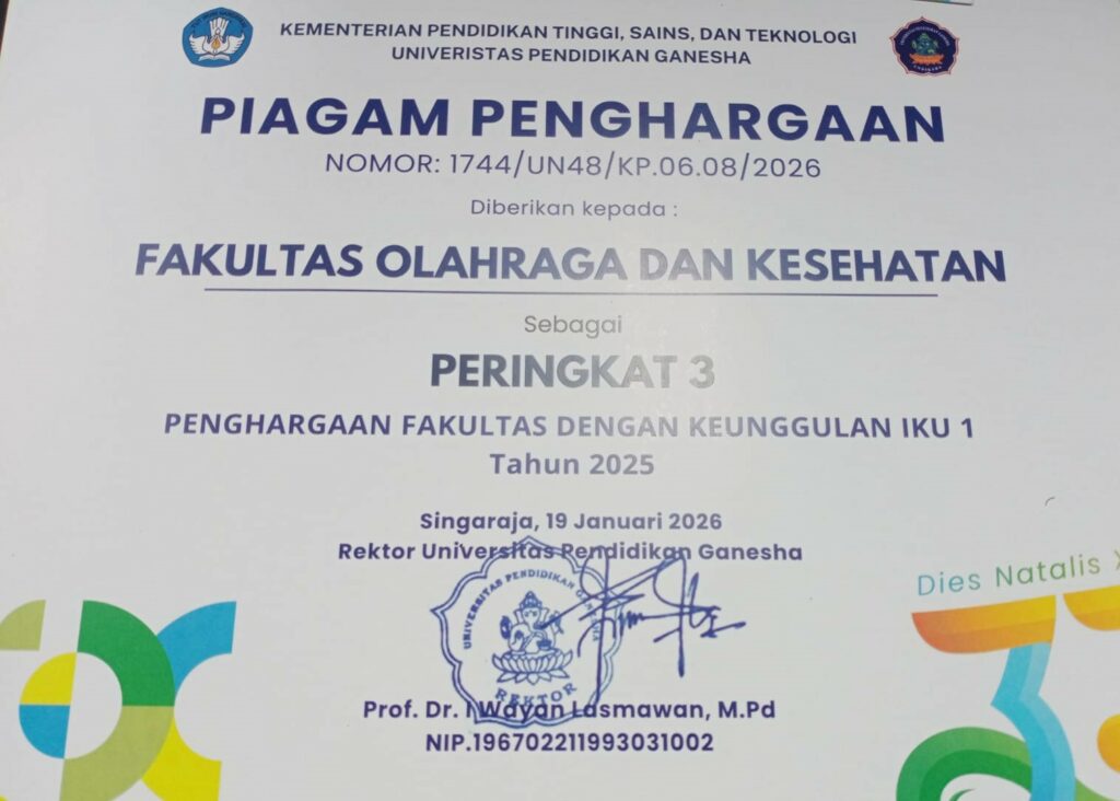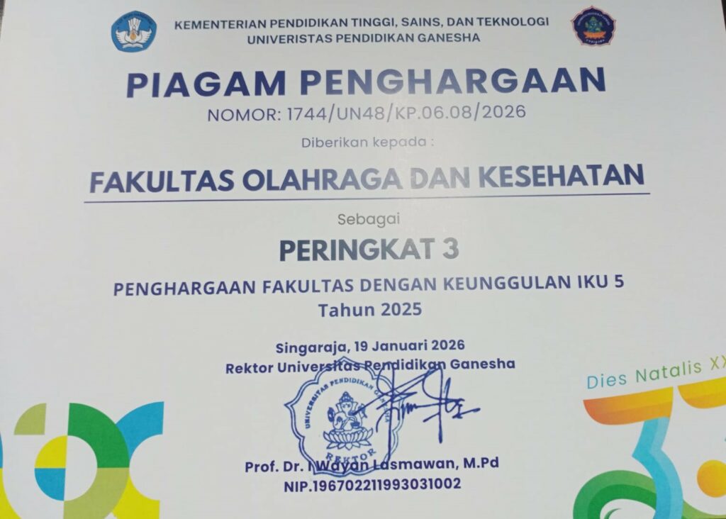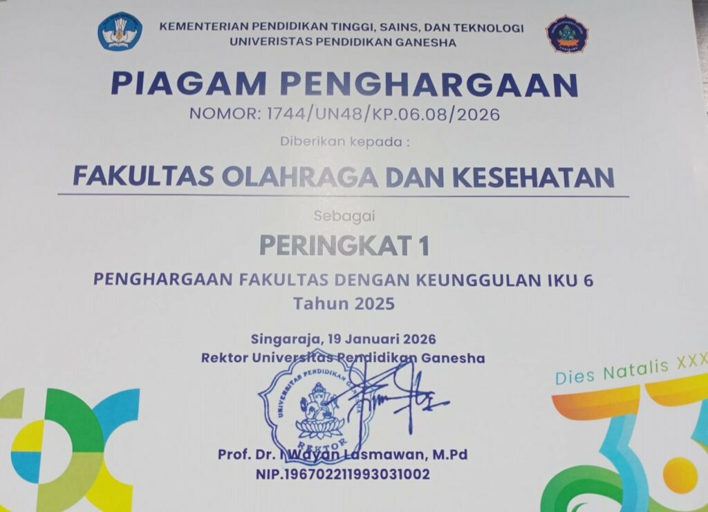 Fakultas Olahraga dan Kesehatan (FOK) Universitas Pendidikan Ganesha (Undiksha) menunjukkan capaian kinerja yang signifikan pada Indikator Kinerja Utama (IKU) Tahun 2025. Berbagai capaian tersebut diumumkan pada Puncak Dies Natalis XXXIII Undiksha yang diselenggarakan pada Senin, 19 Januari 2026, bertempat di Auditorium Undiksha, Singaraja, yang dilaksanakan dalam Sidang Senat Terbuka Undiksha.