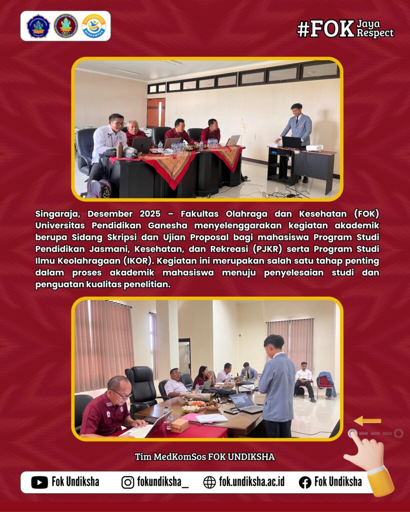 Singaraja, Desember 2025 – Fakultas Olahraga dan Kesehatan (FOK) Universitas Pendidikan Ganesha menyelenggarakan kegiatan akademik berupa Sidang Skripsi dan Ujian Proposal bagi mahasiswa Program Studi Pendidikan Jasmani, Kesehatan, dan Rekreasi (PJKR) serta Program Studi Ilmu Keolahragaan (IKOR). Kegiatan ini merupakan salah satu tahap penting dalam proses akademik mahasiswa menuju penyelesaian studi dan penguatan kualitas penelitian.